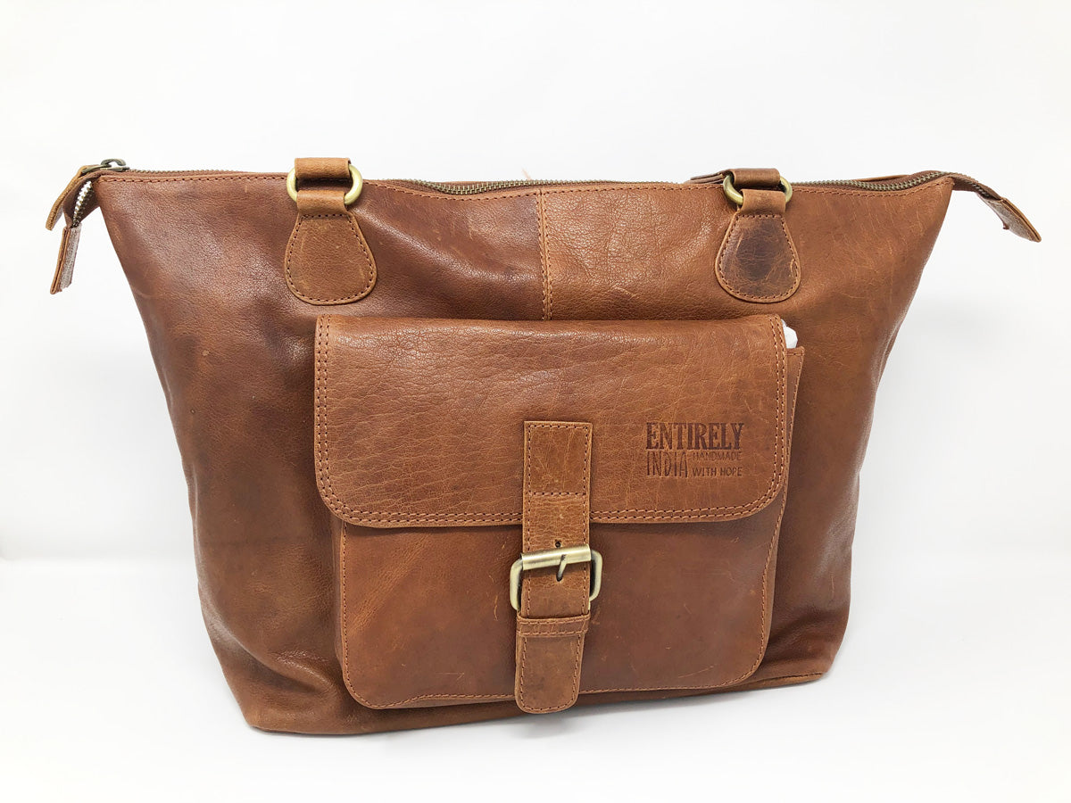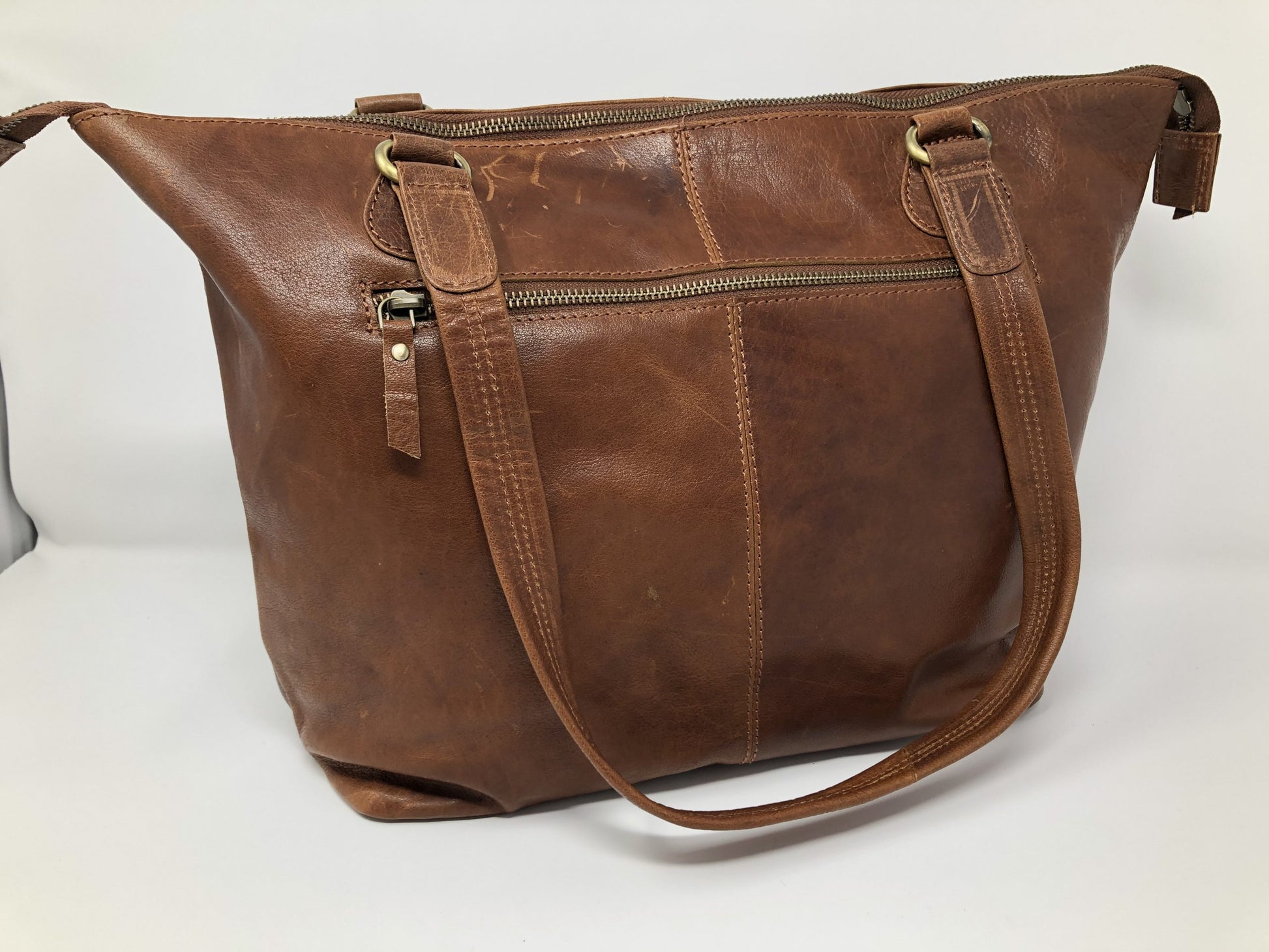 This indestructible buffalo leather tote holds it all! The chestnut-brown bag will stay classic for years to come. Featuring two outside pockets and a zip closure with leather pull, the interior has a zip pocket and a convenient pouch for a phone.